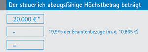 Zur Berücksichtigung des Wertes der Pension, die der Beamte vom Staat erhält, wird vom steuerlich abzugs-fähigen Höchstbeitrag ein fiktiver Beitrag zur gesetzlichen Rentenversicherung abgezogen. Der Abzug beträgt 19,9 % der Beamtenbezüge, berechnet maximal bis zur Höhe der Beitragsbemessungsgrenze Ost (max. 10.865 €).