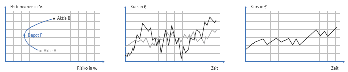 Die nachfolgenden Abbildungen illustrieren die positive Folge dieses Zusammenhangs: Diversifikation führt zur Risikominimierung. Dargestellt sind Risiko und Renditeerwartung der Aktie A, der Aktie B und eines Depots, das aus den Aktien A und B zusammengesetzt ist.