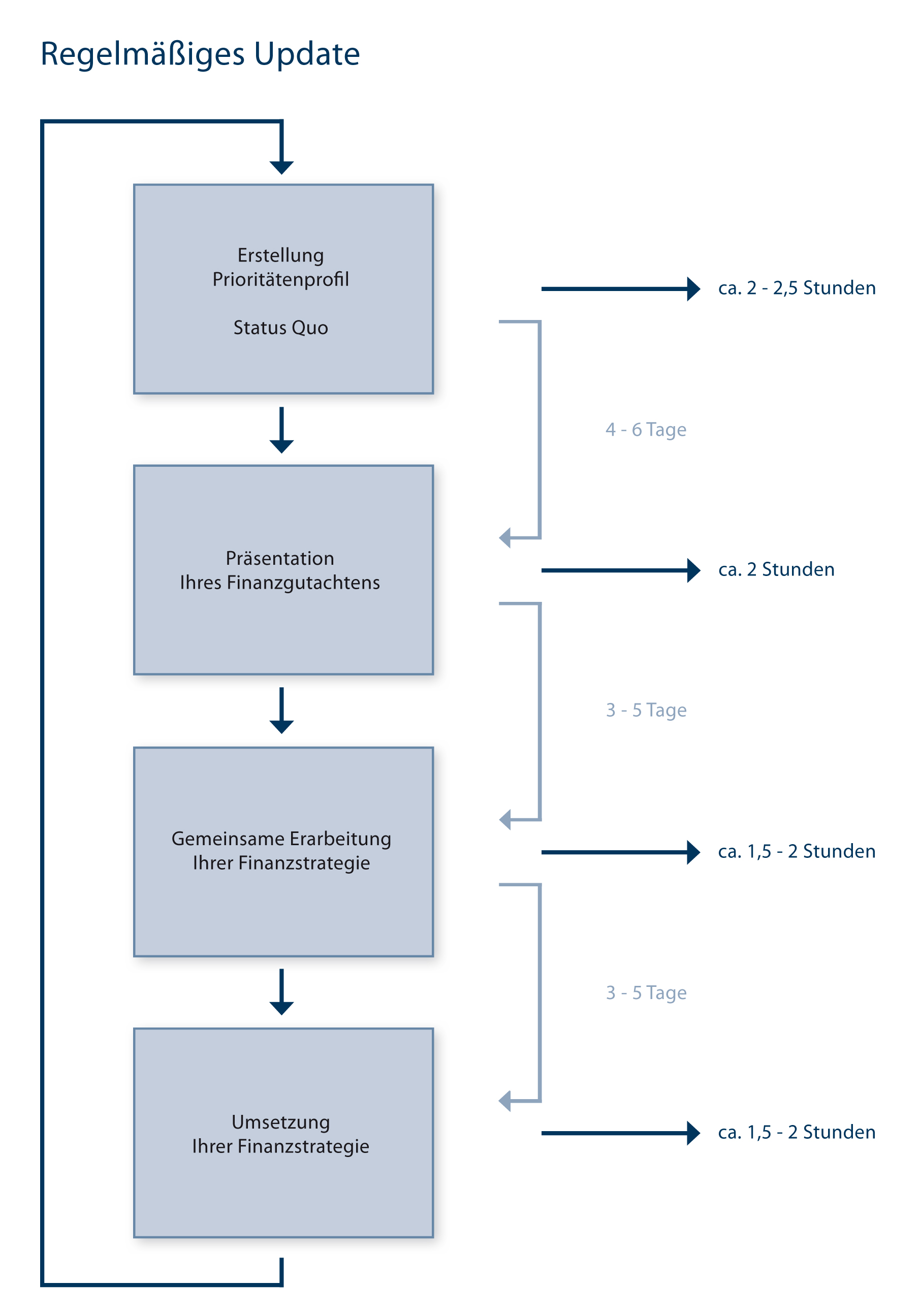Hinsichtlich der weiteren Betreuung ist es unseres Erachtens sinnvoll, regelmäßig ein Update durchzuführen, da sich im Laufe der Zeit Ihre persönlichen Ziele und Wünsche, Ihre Einkommenssituation, die Steuergesetzgebung und andere Faktoren ändern und Anpassungen notwendig machen.